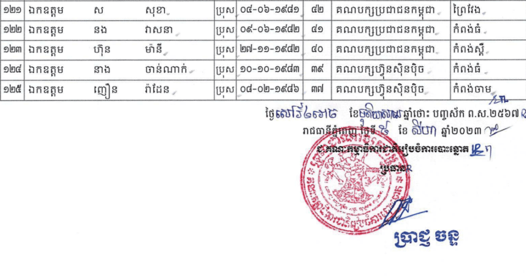 យោងតាមចេញផ្សាយជាផ្លូវការដោយគណៈកម្មាធិការជាតិរៀបចំការបោះឆ្នោត (គ.ជ.ប) នាថ្ងៃទី៥ ខែកក្កដានេះ បានបញ្ចេញបញ្ជីឈ្មោះបេក្ខជនជាប់ឆ្នោតជាតំណាងរាស្រ្ត នីតិកាលទី៧ នៅក្នុងការបោះឆ្នោតជ្រើសតាំងតំណាងរាស្រ្តកាលពីថ្ងៃទី២៣ ខែកក្កដា ឆ្នាំ២០២៣ ដោយក្នុងតំណាងរាស្រ្តចាស់ជាងគេបំផុត គឺសម្ដេចអគ្គមហាពញាចក្រី ហេង សំរិន។
