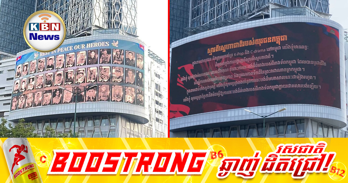 ងាកទៅកាន់អ្នកគាំទ្រក្រុមចម្រៀង BTS ដែលមានឈ្មោះថា Butter Purple វិញបានបង្ហាញពីគម្រោងដែលមានការចូលរួមពីអ្នកស្រលាញ់ Kpop និងវិស័យសិល្បៈចិនបញ្ចាំង LED ពីវីរៈកងទ័ពចំនួន១០ថ្ងៃ។ តាមរយៈការបង្ហោះរបស់ Butter Purple នៅថ្ងៃទី១៥ ខែវិច្ឆិកា បានឱ្យដឹងថាការបង្កើតគម្រោងនេះគឺមិនមានអត្ថន័យអ្វីផ្សេងទេ ក្រៅពីការដឹងគុណដល់កងទ័ពពលីនិងលើកទឹកចិត្តដល់កងទ័ពឈរជើង និងបង្ហាញស្មារតីស្រឡាញ់ជាតិរួបរួមគំនិតតែមួយជាមួយរាជរដ្ឋាភិបាល។ ការបញ្ចាំង LED នេះធ្វើឡើងចាប់ពីថ្ងៃទី១៤ ដល់២៤ វិច្ឆិកា ឆ្នាំ២០២៥ ចាប់ពីម៉ោង១២:០០នាទី ថ្ងៃត្រង់ ដល់ម៉ោង១០យប់ ដែលស្ថិតនៅទីតាំង The Bridge SOHO អគារ Diamond Twin Tower, កោះពេជ្រ សង្កាត់ទន្លេបាសាក់ ខណ្ឌចំការមនរាជធានីភ្នំពេញ។https://blogger.googleusercontent.com/img/b/R29vZ2xl/AVvXsEiTg8_lnTfX6T5_W4wvce-VrqIsmMjuEy-BSJDBOYI9jIbBlhLKAb40ftQ2VZpwhT8XH_qhA4Iotl5Mao5Vf0KJZMzytmGrEaPd6R19Fmq9bzaFDf3JZPnm_8FaXmY0396bwvK5xFk_F0T9M9BJ54cDJADzKIWRC63lfBm4c0Vwg5I7NxhXSAt24_L2XiqT/s1352/image_2025-11-15_14-39-14.png
