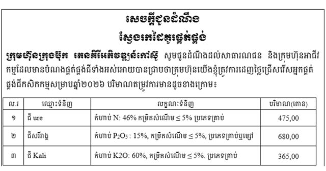 ក្រុមហ៊ុនក្រុងប៊ុក រតនគិរីអភិវឌ្ឍន៍កៅស៊ូ សូមជូនដំណឹងដល់សាធារណជន និងក្រុមហ៊ុនអាជីវកម្មដែលមានបំណងផ្គត់ផ្គង់ជីទាំងអស់អោយបានជ្រាបថាក្រុមហ៊ុនយើងខ្ញុំត្រូវការដេញថ្លៃជ្រើសរើសអ្នកផ្គត់ផ្គង់ជីកសិកកម្មសម្រាបឆ្នាំ២០២៦ បរិមាណតម្រូវការមានដូចខាងក្រោម៖