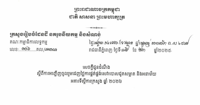 សេចក្តីជូនដំណឹង ស្តីពីការអញ្ជើញចូលរួមដេញថ្លៃការផ្គត់ផ្គង់ប្រេងឥន្ធនៈ ឆ្នាំ២០២៦ ជូនទីស្តីការក្រសួង